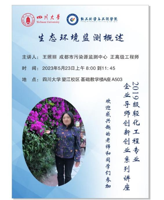 2023年5月23日上午8:00到11:45, 在四川大学望江校区基础教学楼A座A503室,成都市污染源监测中心王照丽高级工程师为学生们做了“生态环境监测概述”的专题讲座。通过该讲座,学生们掌握了环境监测的目的、水环境质量的类别,明确了环境监测未来的重点发展方向。通过学习《制革及毛皮加工工业水污染物排放标准》(GB30486-2013)出台背景以及出台后对制革工业发展的影响,同学们对行业有了全新的认识,更加坚定了制革行业绿色发展的决心。