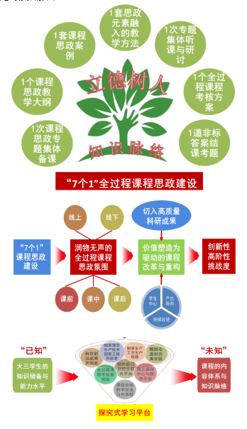 针对行业发展过程中面临人才流失比例大、科技成果转化难度高、对环境污染严重等困境,从国家发展、行业转型、人才成长等方面的需求出发,确立了“激发爱党爱国热情,培养科技强国情怀;强化创新驱动意识,坚持绿色发展理念;坚守工程伦理,树立社会主义价值观”课程思政目标,并以课程知识脉络为导向,持续开展“7个1”全过程课程思政建设,有效解决了课程价值导向不明确,课程思政与课程内容融入不自然,课程思政效果评价难等问题,在营造“润物无声的全过程课程思政氛围”方面积累了具有可复制推广价值的经验,并将其与行业工程需求和高质量科研成果相融合,持续开展价值塑造为驱动的课程改革与重构。