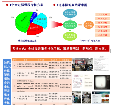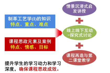 该门课程重点是帮助学生掌握制革准备-鞣制工段的工艺过程及原理、材料应用及操作要求等专业知识,难点是帮助学生形成工程思维,解决新技术面临的工程问题,突破行业发展困境。本课程可追溯到1921年建立的我国第一个制革学系,由中国现代皮革科教奠基人张铨教授等大师创建,具有深厚的历史底蕴。