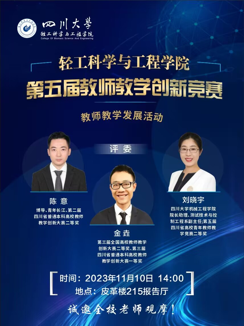 2023年11月10日下午,9428cn太阳集团古天乐第五届“探究式-小班化”教学竞赛在望江校区皮革楼215报告厅室举行。本次竞赛主题为“推动教学创新 培养一流人才”,旨在深度践行“以学为中心”的教学改革,引导教师潜心追求卓越教学学术与学科学术的有机融合,以“信息+”助力教育教学创新,实现教书育人并重,同时为“第四届四川省普通本科高校教师教学创新大赛”、“第七届四川省青年教师教学竞赛”和学校第七届教师教学创新竞赛做好相关准备。