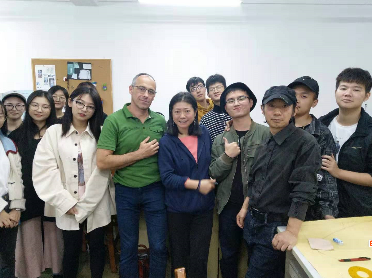 在服装教研室的邀请下,朱得安于10月21日下午3点半来到我校与赵武、冯洁、徐波、曾琦等师生交流。首先在皮革楼209进行座谈,然后在生物质与皮革工程系张金伟老师陪同下参观了皮革楼实验室,对皮革材料的工艺进行了交流。4点半来到了纺工楼5楼服装专业的服饰配件实验室与服装专业的同学们进行了深入的交流,对同学们的皮包设计图的结构、材料的选用及设计与制作构想进行了探讨,将随身背包的设计与制作理念介绍给大家,包括对于负重的背包选用皮材的特点,装钉的位置等。大家对背包上的亮点---刻花非常欣赏,就此刻花的方法展开了探讨,朱利安从背包里拿出专门带来的皮革制作工具、环保的皮革样片演示起制作方法。 从他的熟练、专注与确定的刻花落点、花型的转换,师生们感受到了皮革刻花的上佳制作技艺是怎样的场景。亲自示范之后,邀请大家都来尝试体验皮上刻花,同学们上手很快就成了专注的皮革手艺人。朱利安现场制作的图案造型组合出有序的线条美,让我们切身见证了非遗传承---皮革制品的手工雕刻之美。