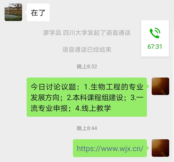为更好地开展专业选修课教学工作,2020年3月17日20:00教研室利用微信语音在线召开了生物工程本科教学工作交流会。会议由教研室主任周荣清老师主持,教研室廖学品、李国英、田永强、吴重德、辜海彬、汤华钊、金垚等任课老师出席了会议。