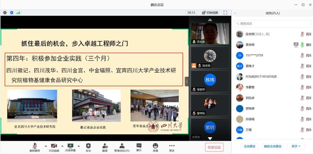 2020年06月21日上午9:00~11:00,我院食品科学与工程专业通过腾讯会议平台,成功举办“卓越工程师班”(省级)选拔的线上宣讲会。会议由食品科学与工程专业教研室主任段飞霞老师主持,参加会议的有食品工程系副系主任曾维才副教授和卓工班企业实践课程的负责人贾利蓉教授以及2017级食品专业的全体同学。