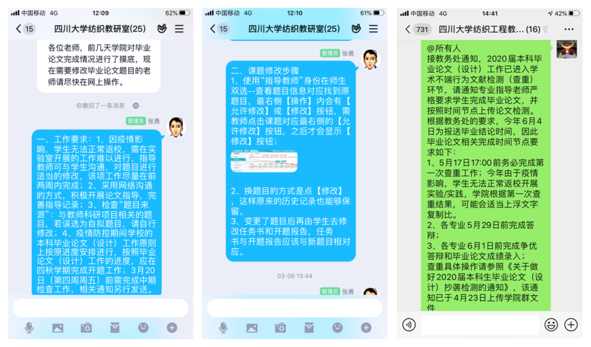 为保证本科生毕业工作不受疫情影响,纺织工程教研室根据学院部署,对毕业论文(设计)完成情况进行了摸底。根据摸底结果,教研室通过微信、QQ群及时更新、发布毕业工作时间节点安排;提醒指导教师和学生及时沟通,调整毕业论文(设计)内容和时间安排,并在毕业论文(设计)管理系统中进行登录。