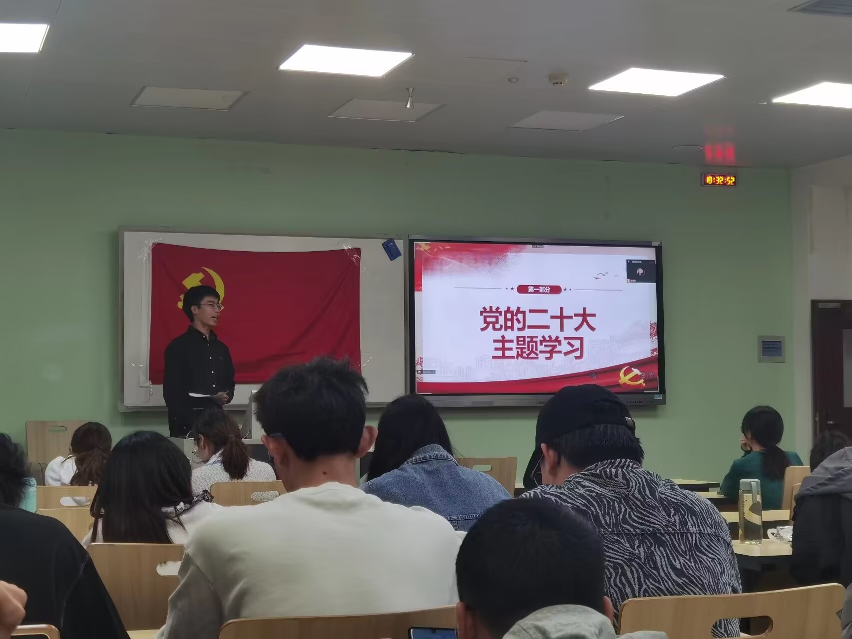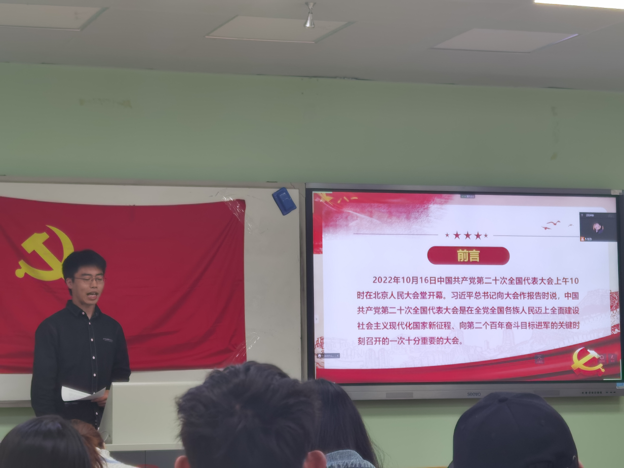 本科生第二党支部李硕同志作为主讲人向与会党员介绍了本次主题党日活动的背景,并分别从过去五年的工作和新时代十年的伟大变革、中国化时代化新境界开辟马克思主义、新时代新征程中国共产党的使命任务等多方面解读党的二十大报告。