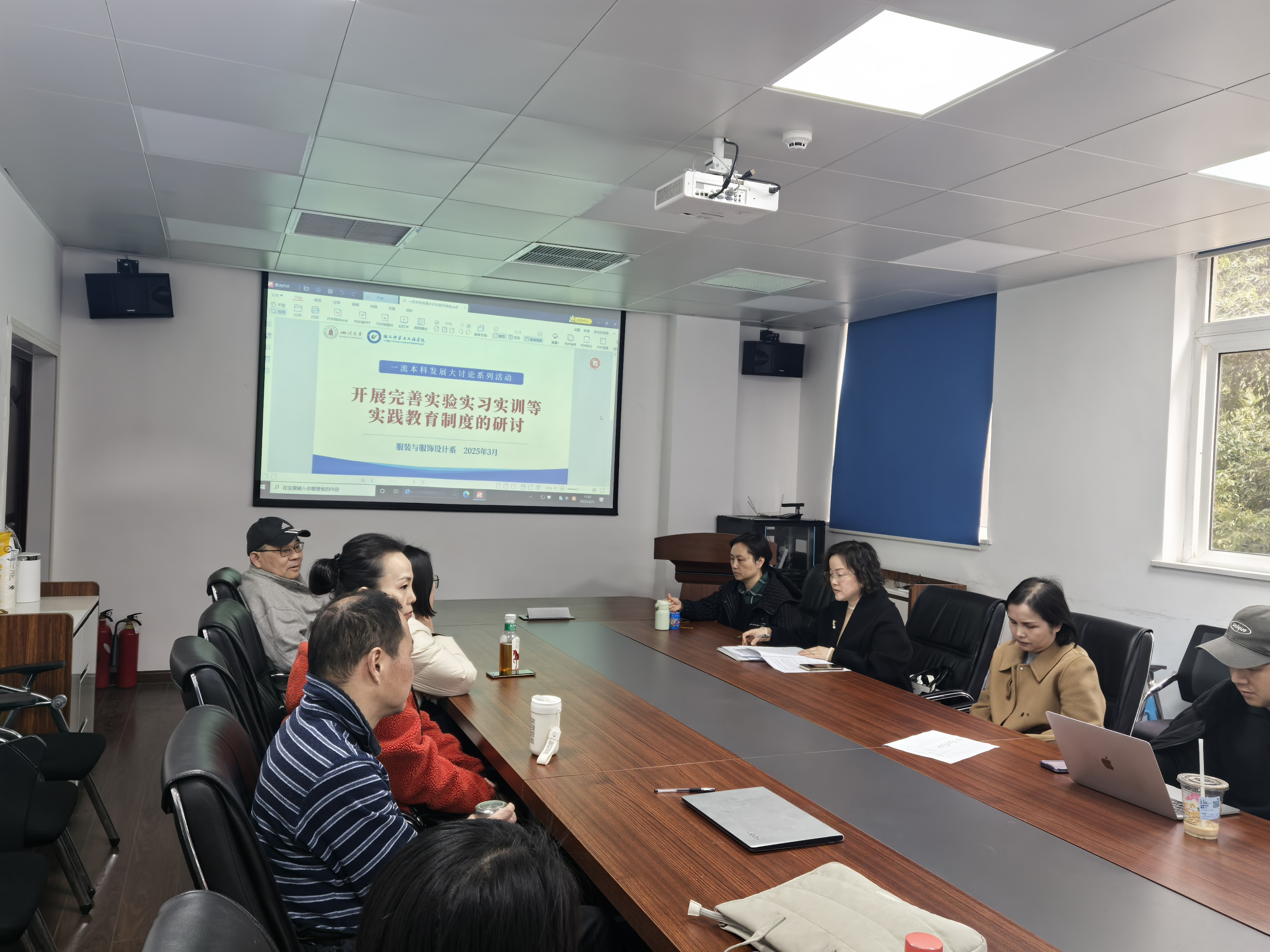 为全面贯彻习近平总书记关于教育工作的重要论述,锚定2035年教育强国建设目标,共同答好“教育强国,川大何为,一流本科何为”的重要命题, 2025年3月21日下午,服装与服饰设计系在纺工楼A204会议室组织全体教师,围绕“加强基层教学组织建设研讨暨教风管风建设月”、“完善实验实习实训等实践教育制度”两大主题展开了研讨。本次研讨邀请到院长彭必雨参会,会议由副系主任申鸿主持。